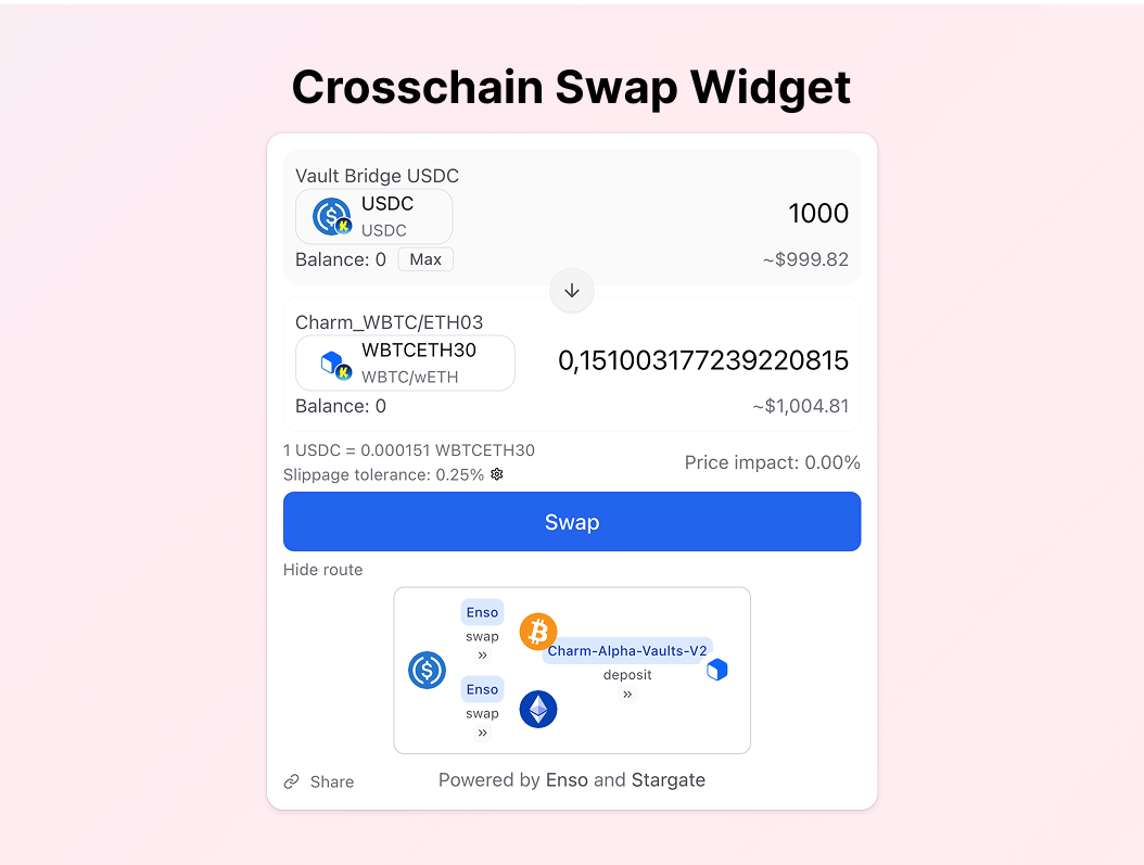 - Crosschain Swap Widget: an off-the-shelf React component enabling one-signature crosschain routing of DeFi positions and native tokens, available as a standalone application or to embed into your UI